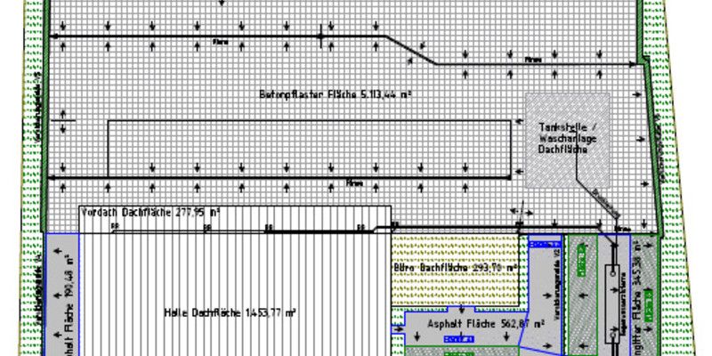 Erstellung eines Entwässerungskonzepts mit der Nutzung von Regenwasser für eine Lkw-Waschanlage. Behördenengineering und Erläuterung der Detailfragen mit der Behörde und den Architekten. Genehmigungsplanung für die Niederschlagsentwässerung. Die großen Mengen benötigten Wassers für die Lkw-Waschanlage machen die Regenwassernutzungsanlage schnell wirtschaftlich. In diesem Fall waren die schlechten Versickerungsverhältnisse und der schon vorgegeben B-Plan eine echte Herausforderung. Es ist aber eine gute Lösung mit Bauherrn, Architekten und Behörde gefunden worden.