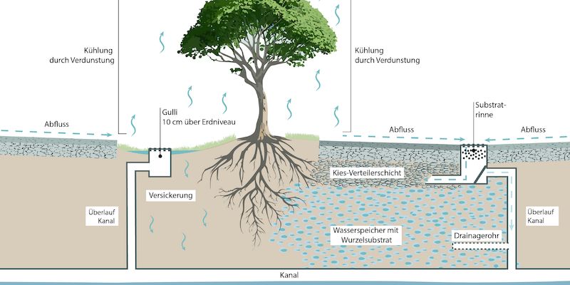 Unser Projekt verfolgt ein klares Ziel: Durch gezielte Entsiegelung, zusätzliche Begrünung und ein nachhaltiges Regenwasserkonzept schaffen wir sogenannte „Cooling Spots“ – klimatisch spürbar kühlere Orte im hitzebelasteten Innenstadtbereich. Zukünftig wird Regenwasser nicht einfach abgeleitet, sondern aktiv genutzt: Es fließt in Versickerungs- und Verdunstungsmulden und wird gezielt Bestandsbäumen zugeführt. So entsteht eine effiziente, nachhaltige Wasserversorgung, die nicht nur den Bäumen zugutekommt, sondern auch das Mikroklima spürbar verbessert.Ein zentrales Element unseres Konzepts: die Integration des Stockholmer Modells zur Schaffung wasseroptimierter Baumstandorte – angepasst an die lokalen Gegebenheiten. Zudem prüfen wir die technische und räumliche Umsetzbarkeit dezentraler Versickerungsanlagen sowie die Möglichkeit kombinierter Lösungen mit kontrolliertem Überlauf in den bestehenden Pfühlbach.